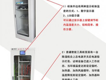 智能安全工具柜由**钢板整体卷压成型,整体造型采用现代工业控制屏柜的风格,表面喷塑,密封性达到EN60529/IEC529标准的防护等级-IP5级;正面为玻璃观察门,观察方便,并装有门控照明灯,门右侧装有显示和控制操作面板(ADZ-3/4型),实时显示柜内和柜外的温度、湿度和设备运行状态。柜底安装有四个万向轮和定位螺杆;柜顶装有四个吊杯,方便运输。