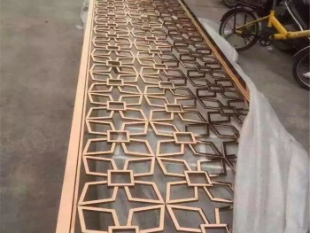 1.不锈钢屏风又名不锈钢花格,不锈钢隔断 2.不锈钢屏风采用材质:201,304. 3.不锈钢屏风表面效果:镜面和拉丝面 4.不锈钢屏风工艺:点焊或者满焊 5.不锈钢屏风颜色:采用真空电镀加工,玫瑰金,古铜,香槟金,钛金,黑钛,玫瑰 红,红古铜,咖啡色,青古铜等。 6.不锈钢屏风包装:泡沫纸+木箱包装 7.不锈钢屏风运输方式:物流或快递。 8.不锈钢屏风运用场所**星级酒店大厅装饰,会所整体装饰,KTV,酒吧,洗浴 中心,专卖店,美容院,电影院,别墅等各大场所。 对外加工:激光切割、剪板、折弯、刨坑(刨槽)、卷圆、焊接各种五金制品等; 经营范围:承接不锈钢装饰工程以及加工各种不锈钢屏风、不锈钢酒柜、不锈钢茶几、不锈钢信报箱、不锈钢踢脚线、不锈钢家具、工艺品等;