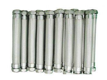 由于制作软管主要零件的材料是采用奥氏体不锈钢,因而保证了软管优良的耐温性和耐蚀性,软管的工作温度范围极广,为 -196—600 度,使用的软管按管道所通介质的腐蚀性选择适用的不锈钢牌号,即可保证软管的耐蚀性。 1.金属软管整体采用1C18Ni9Ti不锈钢材料制成,具有较强的耐腐蚀能力。 2.软管管体为薄壁不锈钢管体液压成形,具有较强的柔韧性、伸缩性、弯曲和抗振能力强、编织网套的加强保护、使之具有更高的承压能力。 3.软管两端的连接还可制成除螺纹、法兰标准之外的其他连接方式,方便连接和使用。 4.该产品不仅适于与旋转接头的配套,而且广泛用于多种流体介质输送的软性连接。