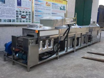图文详情不锈钢面包盘除油清洗机 厨具餐盘位喷淋清洗烘干线厂家: HTA-7000FS型不锈钢面包盘除油清洗机 厨具餐盘自动喷淋清洗烘干线,是一种采用网带传动输送带输送工件,具有清洗液喷洗、清水喷淋漂洗、风机吹水、热风吹干等功能的新颖连续式清洗设备。主要适用于各厂家清洗各种不同型号工件的油、污、垢等。该机具有工位多,功能全,结构合理,操作方便,清洗效果好,对于大批量拉伸件的清洗,劳动环境,提高清洗和吹干质量,具有重要的意义。该清洗机为继电器控制全自动形式,除人工装卸工件外,其它工艺工序过程全部自动完成。人工将要清洗的工件装在输送带上,输送系统自动按顺序将零件依次送往各工序段,对工件进行喷淋碱洗----喷淋漂洗----风机切水----热风吹干、到达下料工位,整个清洗烘干过程即完成。 一.清洗目的:去除工件表面油污、泥垢、灰尘等污渍二. 清洗工艺:1. 清洗剂:水或清洗剂2.工艺流程:上料→喷淋除油1→喷淋除油2→喷淋漂洗1→喷淋漂洗2→活水喷淋→风机吹水→烘干→下料。3、清洗效率:10000plc/天以上 1、设备主体及储液箱1.1、整机为全封闭结构,采用不锈钢骨架,清洗机上罩部分采用单层结构,采用1.2mm 厚的不锈钢304钢板制作,烘干段设置保温层,降低能耗。1.2、液箱采用单层结构,采用1.5mm 厚的304不锈钢板制作(可按要求颜色喷涂油漆);内部用隔板分成几个区域,分别实现对清洗液的过滤、滤油、分油;液箱设有补水口、排液口、溢水口。底部为两边向中间倾斜,清洗液从液箱底部的排液口集中排出。1.3、液箱装,液位异常时及时提醒补水、停水。异常情况实现紧急停机,并设有声光。1.4、液箱内部装有不锈钢电加热器,在30~60分钟内将液体由室温升至使用温度。温度自动控制在10~70℃范围,人工设定、自动控制。设有温控仪表自动显示。液箱外贴保温棉,防止热量散发。 2、输送系统系统由传动电机、输送网带、导轨、主传动轴、被传动轴组成。传动网带采用常用304不锈钢网带。网带总宽0.6米,两边采用6分双节距大滚珠链条,中间每隔114.3mm串一根10mm串杆,中间再配以不锈钢304网带。输送带输送速度在0.5~2m/min连续无级可调。3、清洗系统3.1、清洗系统由清洗泵、喷淋清洗管路、喷咀等组成。喷嘴为角度可调式,可在30度范围内调整射流方向。每个喷头相隔距离≤120mm,喷淋管路上、下、左、右均有喷头布置,确保工件各个面均能洗到。3.2、系统管路采用不锈钢管,喷咀为塑胶耐高温喷嘴,喷嘴能快速更换、拆卸、方向可调。3.3、清洗水泵采用立式液下管道泵,清洗流量≥35m3/h,清洗压力≥350Kpa,压力可调。 4、漂洗系统4.1、漂洗系统由漂洗泵、喷淋漂洗管路、喷咀等组成。喷嘴为角度可调式,可在30度范围内调整射流方向。每个喷头相隔距离≤120mm,喷淋管路上、下、左、右均有喷头布置,确保工件各个面均能洗到。4.2、系统管路采用不锈钢管,喷咀采用塑胶耐高温喷嘴。4.3、漂洗水泵采用立式液下管道泵,清洗流量≥35m3/h,清洗压力≥350Kpa,压力可调。5、风机吹水系统5.1、切水系统由高压风机、风刀、软管、斜坡等组成。可吹干工件上大部分水,防止水浪费。 6、热风烘干系统6.1、系统由离心风机、空气加热器、温控器等组成。6.2、离心风机使烘干箱内的热空气循环使用,避免损失,来自不锈钢加热器的热风(常温~100℃可调)经风管吹向输送的工件,工件无水干燥。6.3、烘干加热采用电加热和生物质燃烧机加热两种方式组合使用。售后服务:机器自验收合格以后保修一年,终身维护,维修速度快,长期提供技术维护,厂家咨询电话:136 9070 2140 田生 微信同号 网上报价仅供参考,欢迎来电咨询。设备实拍图:
