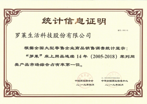 4月9日,2019(第二十七届)中国市场商品销售统计结果新闻发布会在北京召开。据中国商业联合会、中华全国商业信息中心发布的调研结果显示,罗莱生活科技股份有限公司(以下简称罗莱生活)旗下“罗莱”品牌床上用品、各种被同时并列2018年度全国市场同类产品市场综合占有率第一位,这已是“罗莱” 牌床上用品连续14年(2005-2018)荣列同类产品市场综合占有率第一位、“罗莱” 牌各种被连续13年(2006-2018)荣列同类产品市场综合占有率第一位。