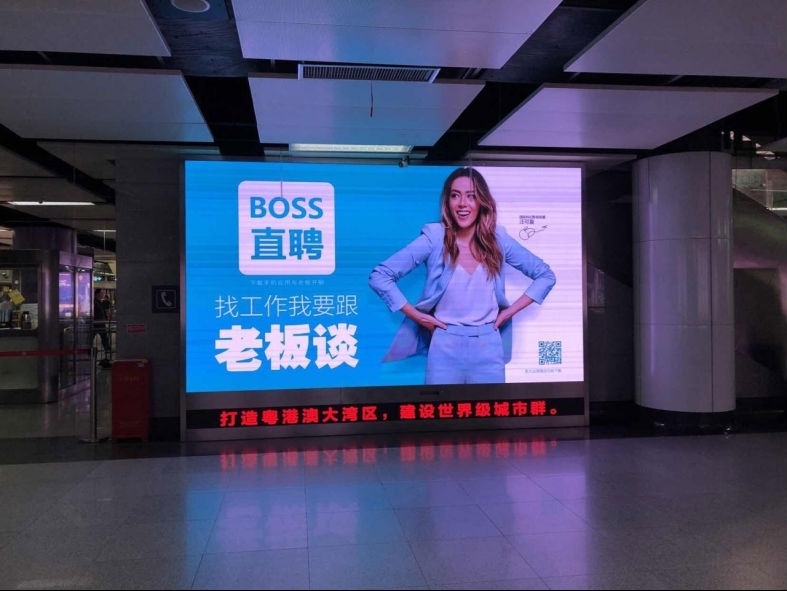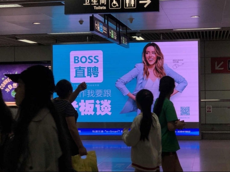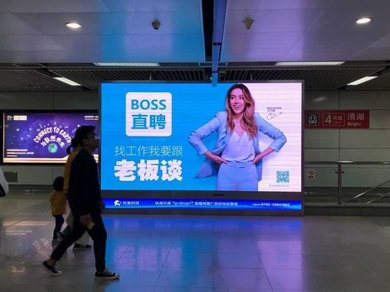 在招聘高峰季,BOSS直聘邀请国际科幻影视明星汪可盈担任BOSS直聘首席快乐官,在深圳虎童科技有限公司的独家智能LED大屏中亮出BOSS直聘极具感染力的slogan“找工作,我要跟老板谈!”。