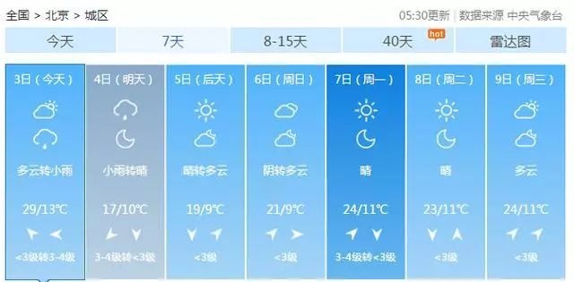 详细到北京,依据北京市气象台今日06时气候预告:今日白日,晴转阴,早晨轻雾,北转春风2、3间4级,最高气温29℃,最小相对湿度40%;今日夜间,阴转小到中雨,东转冬风3、4级(阵风6级),最低气温13℃,最大相对湿度95%。