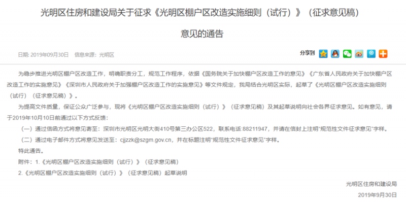 近来(9月30日),光亮住建局发布关于《光亮区棚户区改造施行细则(试行)》(征求定见稿),并予以公示。