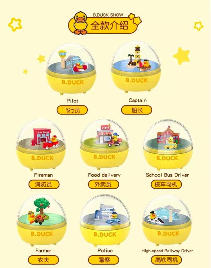 千人一面的城市日子太简略单调,假如工作或许人生可以交流,你想做什么?是在海边做一位冲浪运动员,仍是去田园里当一位农民?要不要当个英俊的飞机师啊?看看电影《我和我的祖国》里开战斗机的宋佳,真是帅爆了!或许,像光头警长刘sir那样做差人……B.DUCK工作系列的创意正是来自于咱们心里经常会有的这些主意。该系列共有9款,对应9个工作。此外,它们也是音乐盒,每个工作对应的乐曲不同。想知道不同工作对应什么音乐,现在就下手吧。