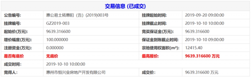 中国网地产讯 10月10日,广东省惠州市以网上挂牌交易方法成功出让一宗商住用地。终究,惠州市恒兴业房地产开发有限公司(金辉集团)以底价9639.32万元摘得,楼面价3235元/㎡。