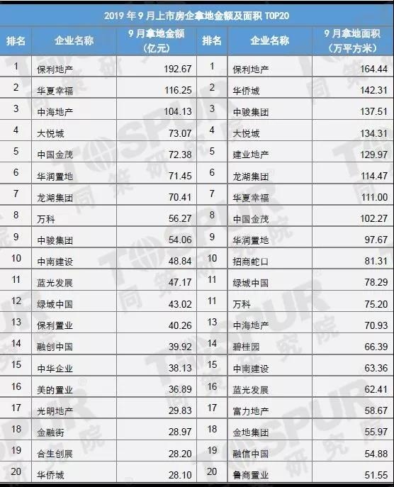 2019年9月上市房企拿地金额TOP20。数据来历:同策研究院