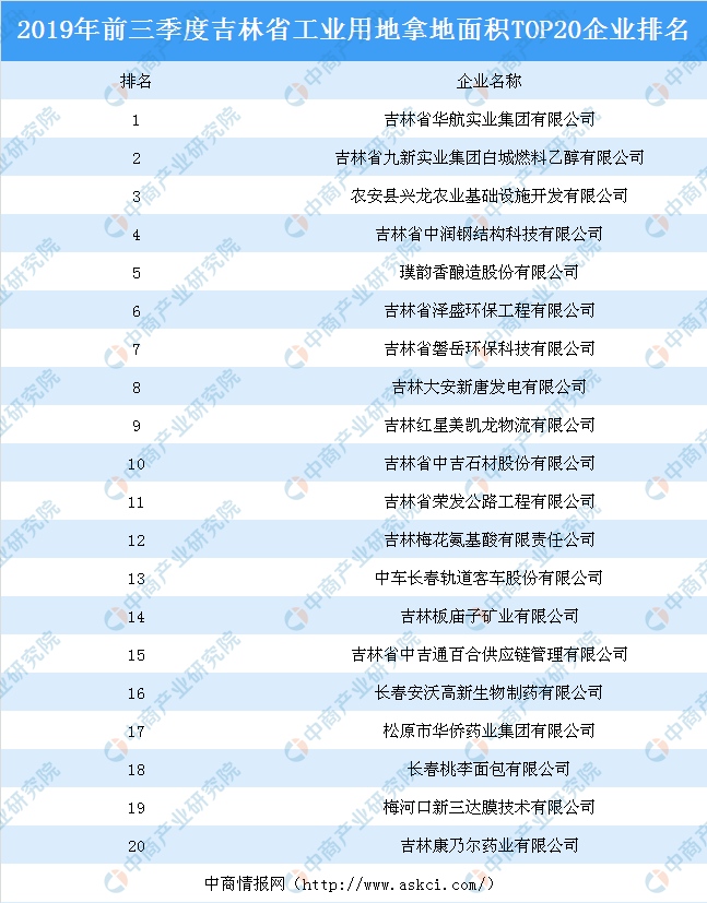 据中商工业研究院工业地产情报库监测数据显现:2019年前三季度吉林省工业用地拿地面积TOP20企业排行榜已揭晓。据榜单显现,吉林2019年前三季度工业用地拿地面积排名前十企业分别为:吉林省华航实业集团有限公司、吉林省九新实业集团白城燃料乙醇有限公司、农安县兴龙农业基础设施开发有限公司、吉林省中润钢结构科技有限公司、璞韵香酿制股份有限公司、吉林省泽盛环保工程有限公司、吉林省磐岳环保科技有限公司、吉林大安新唐发电有限公司、吉林红星美凯龙物流有限公司以及吉林省中吉石材股份有限公司。其间,吉林省华航实业集团有限公司工业用地拿地面积排名榜首。