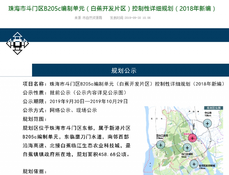 2019年9月30日,珠海市自然资源局发布了珠海市斗门区B205c编制单元(白蕉开发片区)控制性具体规划,公示内容包含具体的规划功用和区域定位,清晰白蕉开发片区的服务设备能工,打造白蕉镇产城归纳服务中心,成为西部临江生态农业科技城以及生态宜居的岭南水乡。