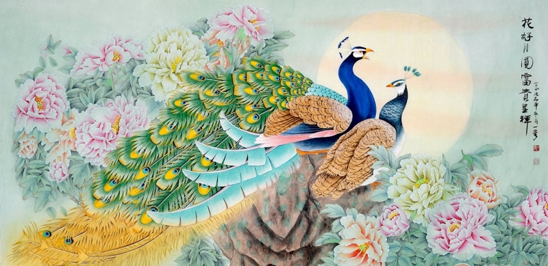 孔雀属阳鸟,百无禁忌,挂在家中可化煞镇宅,更是吉利如意的标志,这幅《花好月圆》,整个画面的画风是新鲜浓艳,温暖诱人的,给人的感觉是异样的心爱。粉色和青色的相互交织,让画面的甜美感瞬间提高,远处模糊的月亮作为烘托,圆圆满满的感觉让涵义愈加的夸姣。