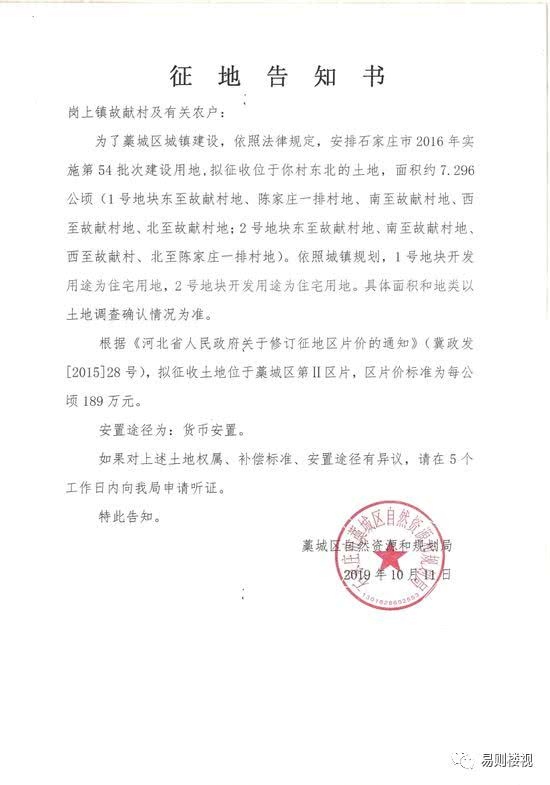 10月12日,易则楼视得悉,石家庄市藁城区自然资源和规划局发布了两则征地奉告书。