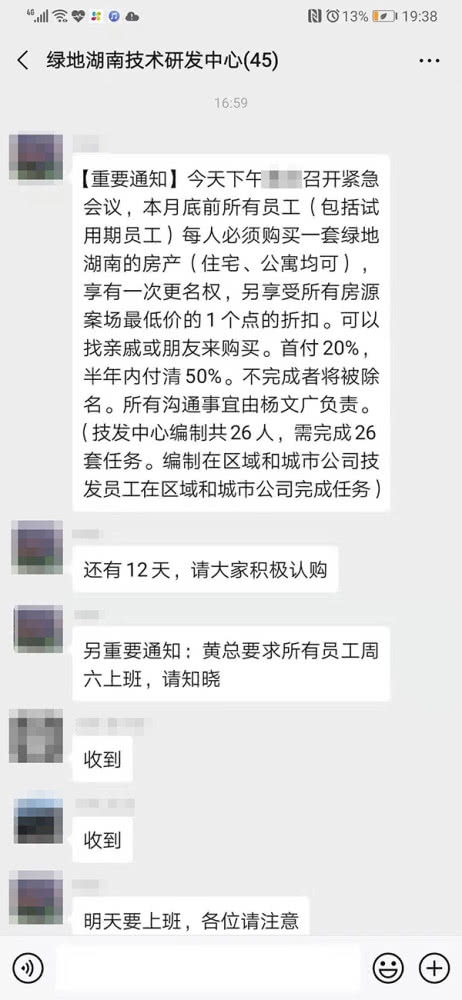 上述职工称,上星期其地点中心担任人“梅总”在微信作业群里发布“重要告诉”:“今天下午黄总举行紧急会议,本月底前一切职工(包含试用期职工)每人有必要购买一套绿洲湖南的房产(住所、公寓均可),享有一次更名权,另享用一切房源案场最低价的1个点的扣头。能够找亲属或朋友来购买。首付20%,半年内付清50%。不完结者将被开除。(技发中心编制共26人,需完结26套使命)。”
