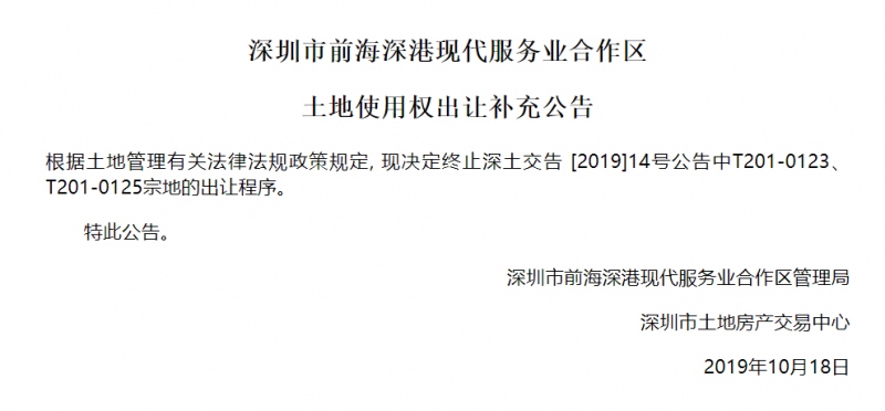 最新消息,深圳市土地房产交易中心发布告诉,原定(今日)10月22日出让前海桂湾的两块宗地(T201-0123、T201-0125)停止出让。