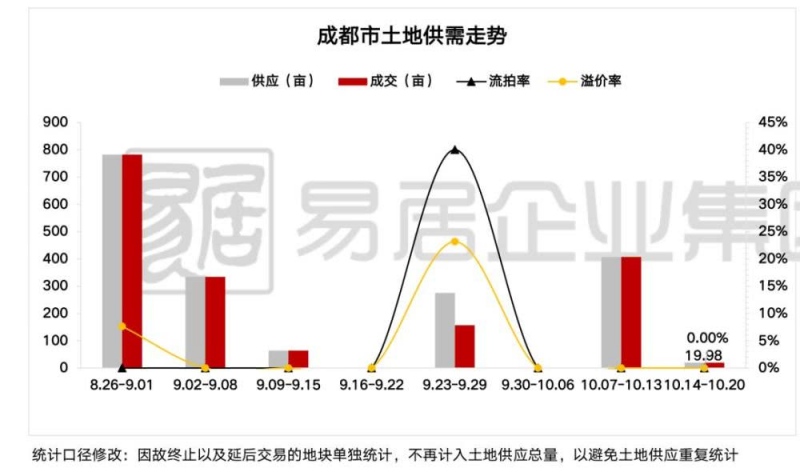 本周大成都规模内,供给土地1宗;算计面积19.98亩,环比下降95.09%;成交土地1宗,算计面积19.98亩,环比下降95.09%;流拍土地0宗,因故停止土地0宗,流拍率0%,溢价率0%;