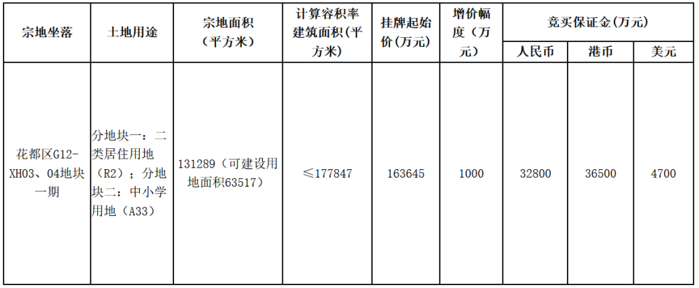 材料显现,标的编号为T2020-039,坐落花都区,地块名称为花都区G12-XH03、04地块一期。宗地面积131289平方米,可邮递用地面积63517平方米,核算容积率修建面积≤177847平方米,开始价163645万元,开始楼面价9201.45元/㎡,添加起伏1000万元,竞买保证金32800万元,最高限价为237286万元。