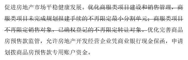 依照3月3日第一版发布的内容,《告诉》第三十一条显现,促进房地产商场平稳健康发展。优化商服类项目建造和出售办理,商服类项目未完成规划报建手续的不再限制最小切割单元;商服类项目不再限制出售方针,已确权挂号的不再限制转让方针。