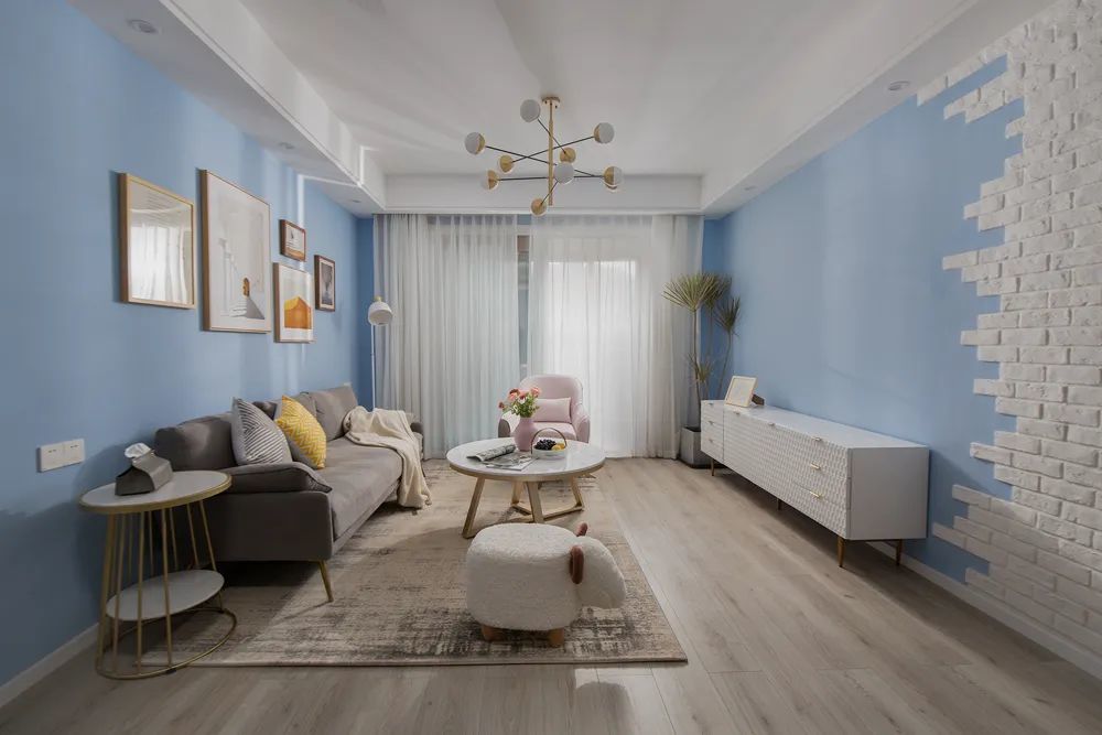1、客厅装饰:客厅全体用天蓝色进行装点,让空间显得自但是新鲜,背景墙加以白色文明砖装饰,将“天空”放到了眼前,营建舒适而温馨居家气氛。