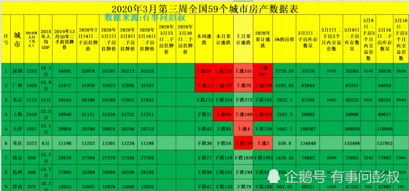 2020年3月第三周全国59个要点城市楼市数据出炉。本周房价上涨的城市7个,房价跌落的有52个。