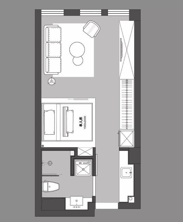 从平面计划图可以正常的看到,这个户型归于典型的独身公寓,也和现如今大多数小户型差不多。而在功用规划上,采用了传统的一室一厅一厨一卫的结构来处理,除了没有一个独自的餐厅,功用性这块基本上算是比较彻底的了,详细经过下面的实景给我们剖析。