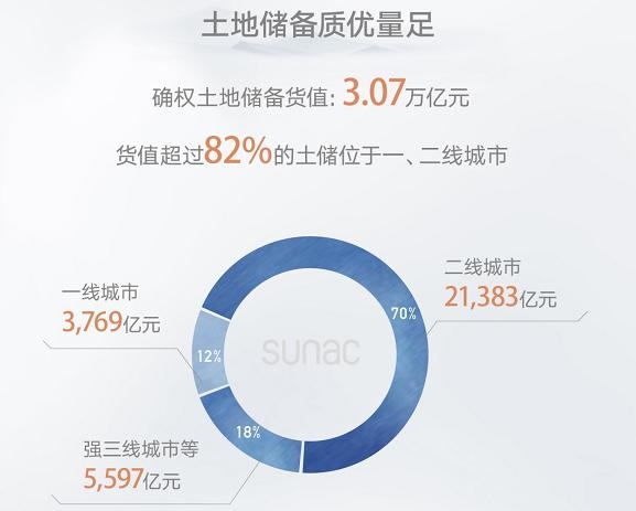 孙宏斌慎重的底气,在于融创优质的土地储藏。2019年,融创拿下货值约1.34万亿的高质量土储。期末,集团确权土地储藏货值约3.07万亿元,其间超82%坐落一二线城市。