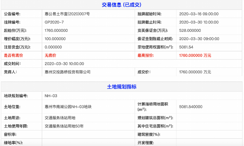 3月30日,惠州惠城区2宗地块被惠州交投路桥投资有限公司以底价3760万元竞得。