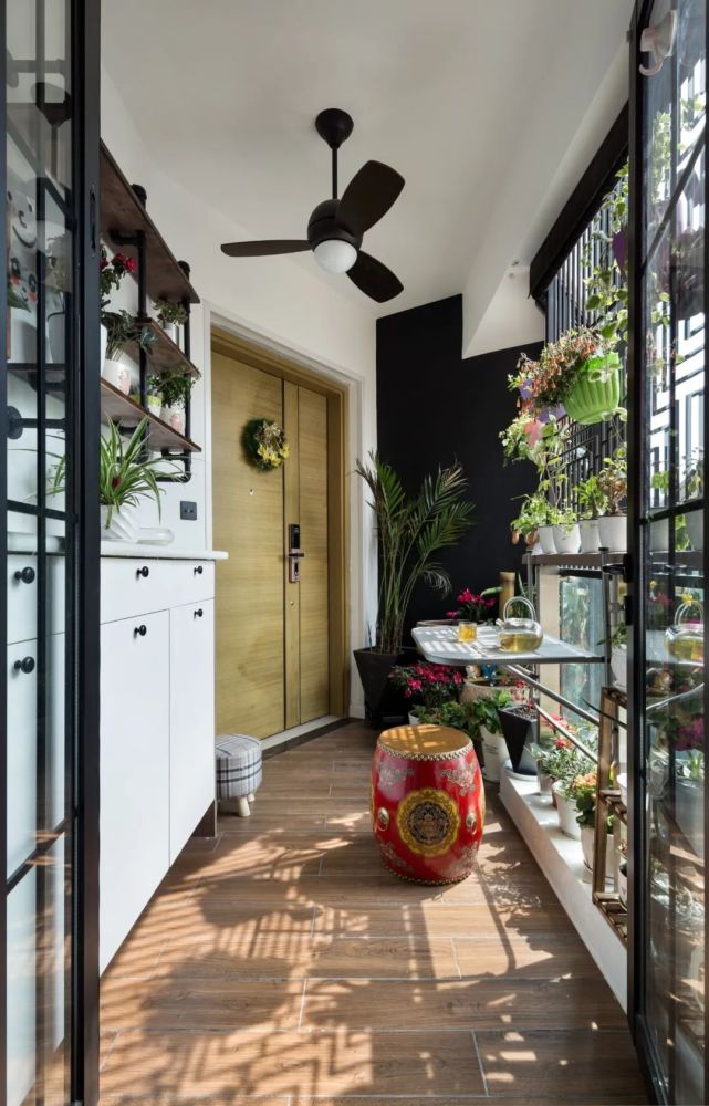 在入户花园的靠窗部分装上防盗网,然后把小盆栽挂上去,让整个窗户都安置成绿意新鲜的空间,一回到家就充溢生动与活力的气味,让日子愈加天然惬意。这种规划适宜较为细长的入户花园。