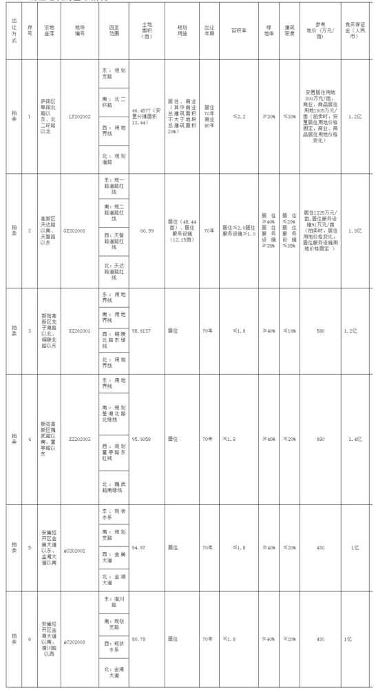 庐阳区LY202002号地块坐落庐阳区阜阳北路以东、北二环路以北,面积46.4577(安顿分摊面积13.44),规划用处:寓居、商业(其间商业总修建面积不大于地块总修建面积20%)。寓居70年,商业40年,容积率≤2.2,修建密度≤22%,绿地率≥30%。参阅地价安顿寓居用地300万元/亩,商业、产品寓居用地1605万元/亩(拍卖时,安顿寓居用地价格固定,商业、产品寓居用地价格改变),竞买保证金1.2亿。