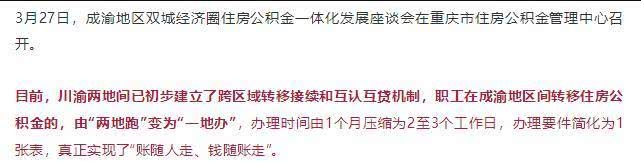 据重庆日报音讯,3月27日,成渝区域双城经济圈住宅公积金一体化开展座谈会在重庆市住宅公积金管理中心举行。记者了解到,现在,川渝两地间已开始建立了跨区域搬运接续和互认互贷机制,员工在成渝区域间搬运住宅公积金的,由“两地跑”变为“一地办”,处理时刻由1个月紧缩为2至3个作业日,处理要件简化为1张表,真实完成了“账随人走、钱随账走”。