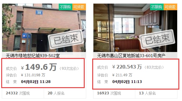 今日我在阿里拍卖司法频道重视到2套惠山新城法拍房源,总共招引了超4次围观,最多一套房有20人报名,2套房源都超越起拍价和评估价成交,最高一套超出起拍价72.5万成交!