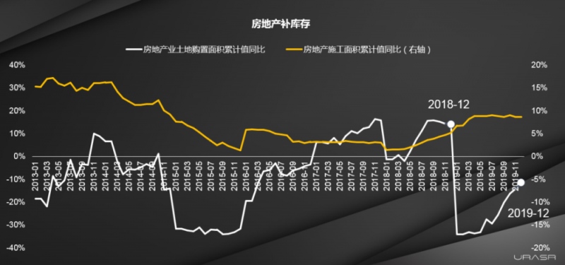 首要,客观上来看,现在正是开发商补库存的周期节点,2018年,地产施工面积同比稳中有涨,开发商有货在手,地产商场中期供应相对富余,但同年四季度,房企土地置办面堆集计同比断崖式跌落,继续到2019年四季度都是负添加,曩昔一年多的时间里,大部分开发商土地储备是呈耗费状况。