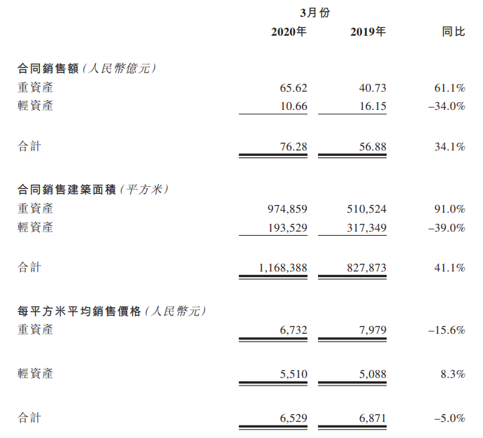 陈述数据显现,2020年3月份,集团获得物业合同出售额人民币76.28亿元,同比增加34.1%,合同出售建筑面积116.84万平方米,同比增加为41.1%。 2020年3月份每平方米均匀出售价格为人民币6529元,同比削减为5.0%。
