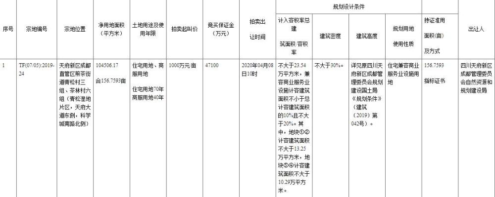 地块编号TF(07/05):2019-24,地块坐落天府新区成都直管区煎茶大街青松村三组、茶林村六组(青松湿地片区,天府大路东侧,科学城南路北侧),净用地面积10.45万平,出让年限为住所七十年,商服用地四十年,开始价1000万元/亩。