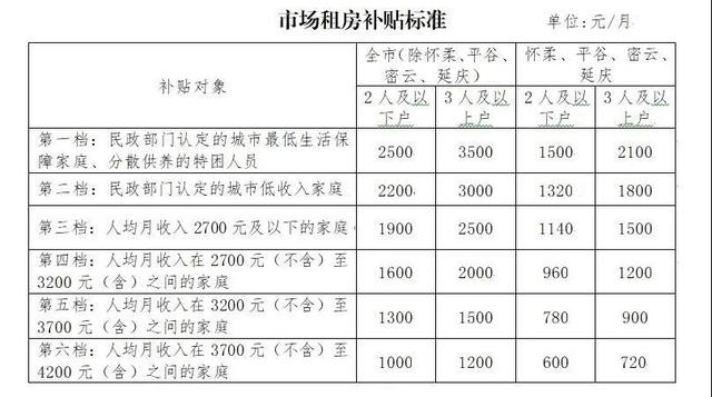 除怀柔、平谷、密云、延庆外的其他区,2人及以下户最高补助规范2500元,最低补助规范1000元;3人及以上户最高补助规范3500元,最低补助规范1200元。