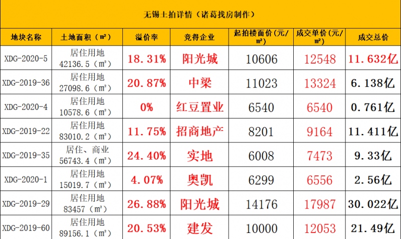 3月31日,无锡2020年榜首场土拍闭幕。其间8宗涉宅地,土地出让总面积40.72万㎡,总成交价93.3452亿元,包含惠山区、新吴区、经开区、锡山区、梁溪区5大区域。