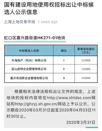 4月11日,开标10日后,在上海土地市场官网上,虹口区嘉兴路大街HK271-01地块,仍显现还在“买卖中”。