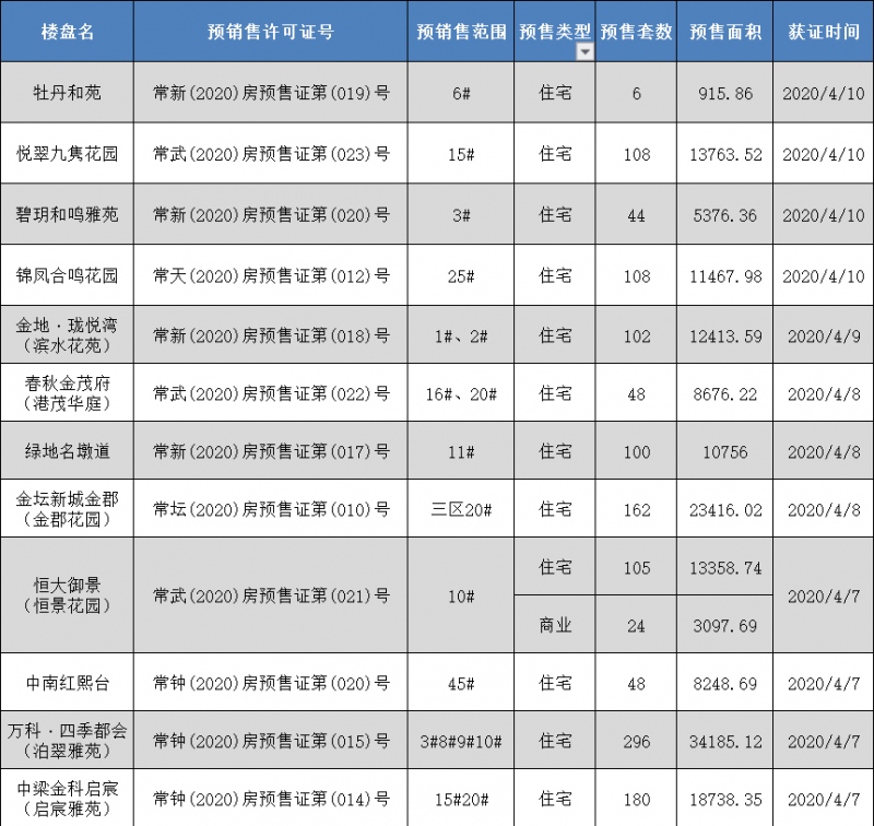 据乐居买房计算,常州(2020年4月7日-4月10日)12个楼盘收取预售证,合计1307套住所房源,预售面积161316.5平米。