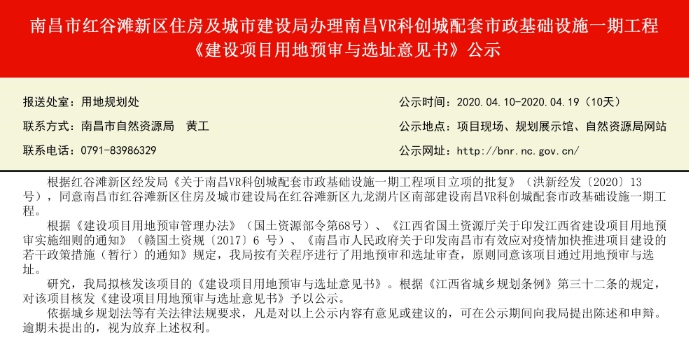 近来,南昌市红谷滩新区住宅及城市建造局处理南昌VR科创城配套市政基础设备一期工程《建造项目用地预审与选址意见书》公示。九龙湖VR科创城具体路网出炉。