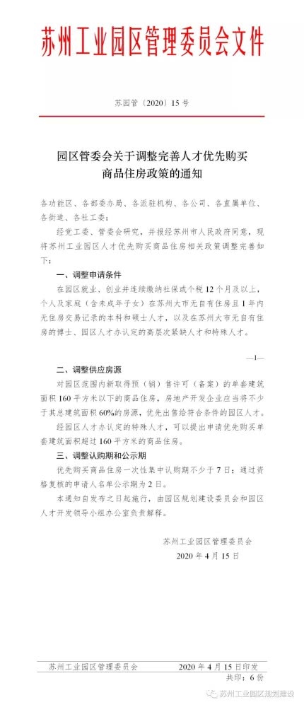 4月15日,姑苏工业园区规划建造委员会官方大众号发布《园区管委会关于调整完善人才优先购买产品住宅方针的告诉》(以下简称《告诉》),说到对园区人才优先购买产品住宅方针有所调整。