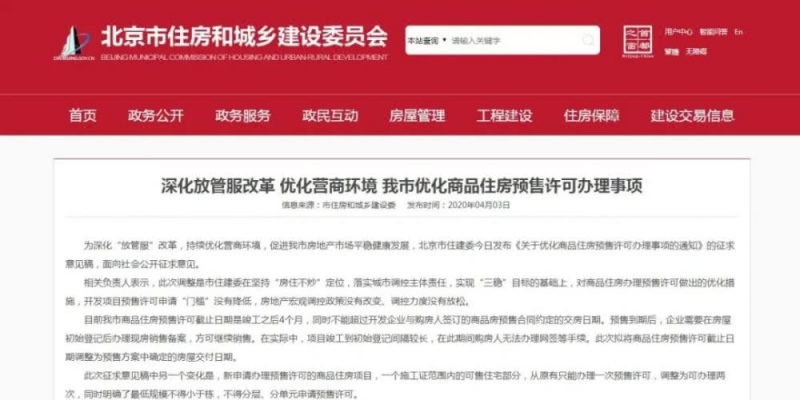 4月3日,北京市住建委发布《关于优化产品住所预售答应办理事项的告诉》的征求意见稿,清晰新请求办理预售答应的产品住所项目,一个施工证范围内的可售住所部分,从原有只能办理一次预售答应,调整为可办理两次。