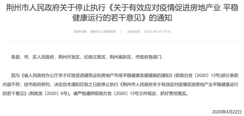 但该方针上演了“两日游”,荆州市政府官网于4月22日发布告诉称,因与《省人民政府办公厅关于印发促进建筑业和房地产商场平稳健康发展办法的告诉》部分条款内容不符,经市政府研讨,决议中止履行4月20日发布的楼市方针。