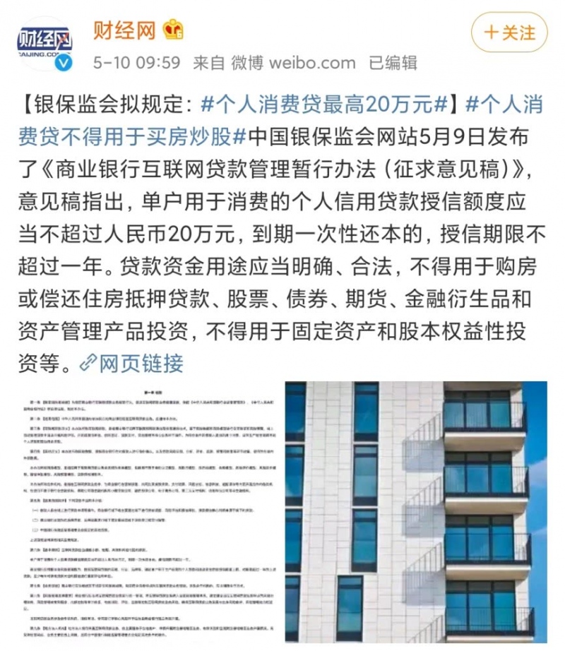 银保监会:互联网消费借款个人授信不超20万元;借款资金不得用于购房、炒股等;不得托付暴力催收组织催收借款。