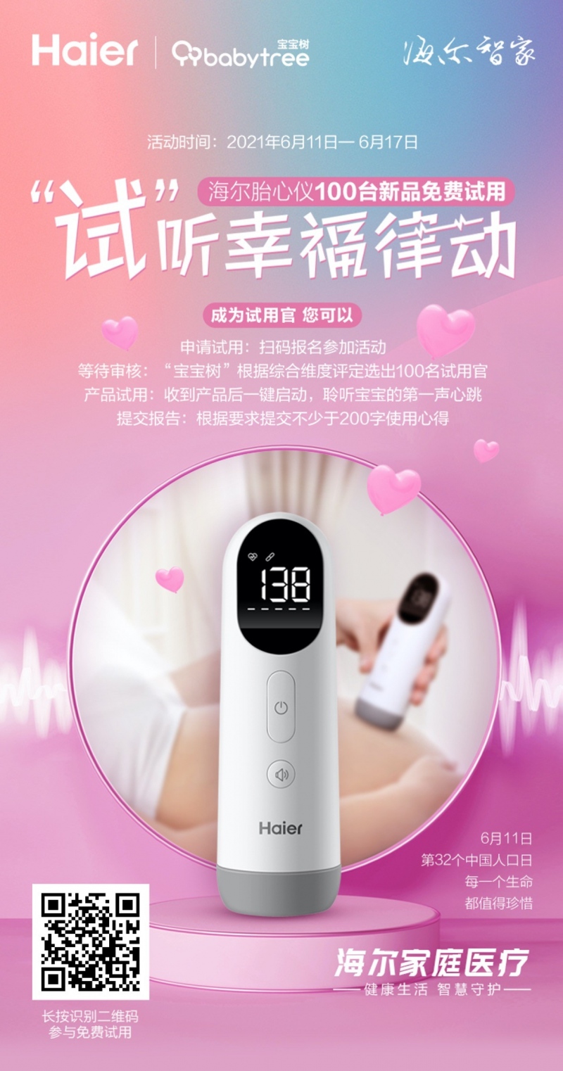 提升生育质量、保障母婴健康,是全社会的共识,是每个家庭的福祉,是所有参与母婴事业的企业与机构共同的目标。海尔家庭医疗承接海尔智家全屋健康使命,从移动互联网、大数据、云计算、人工智能等技术高度打造智慧健康方案,赋能健康生活。此次海尔胎心仪与宝宝树联合发起的试用活动,必将更好地普及家用胎心仪产品,升级家庭健康体验,让更多准妈妈获得健康保障和幸福关怀。正在孕期或者计划进入孕期的准妈妈,快快点击下方链接参与吧!