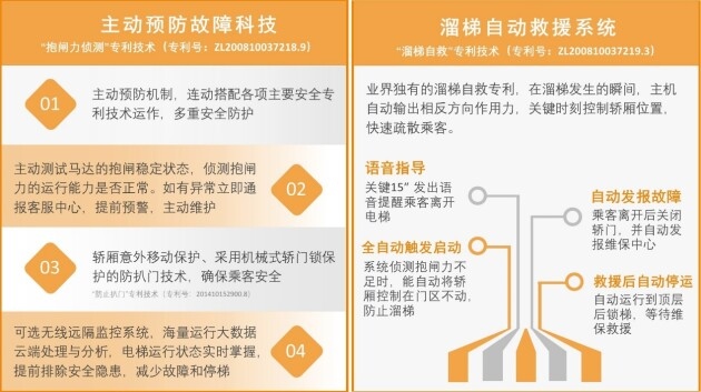 加装电梯为民生工程,安全问题首当其冲成为国家、社会、市民等多方关注的焦点。永大电梯特有主动预防故障科技及溜梯自助救援系统(包含独有安全技术发明专利),以测试-加强-预判三种启动方式为基础,结合多项主要安全专利技术运作,达到事故主动预防、主动维护的功能,为社区电梯加装安全保驾护航。