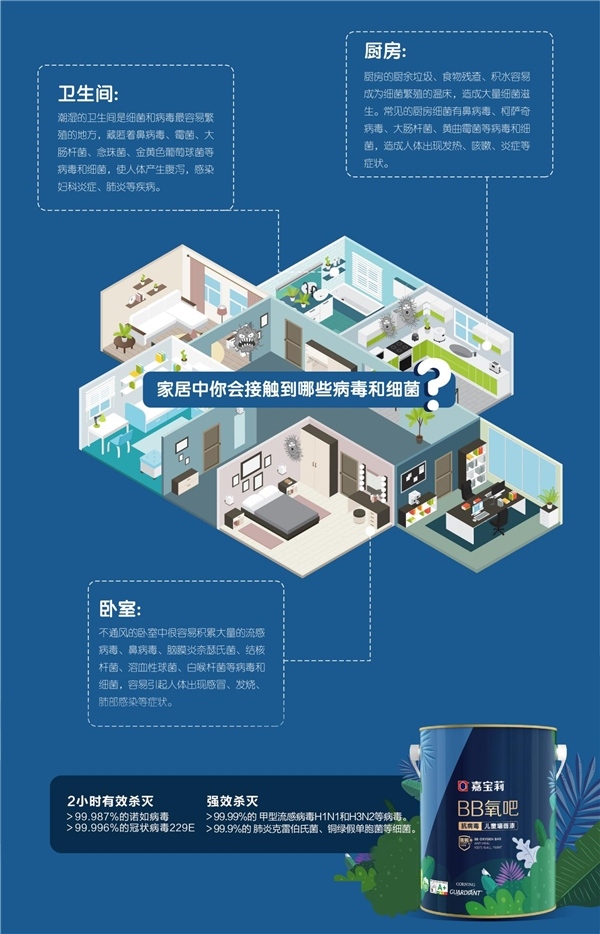 新型冠状病毒传播速度快、隐匿性强,不能掉以轻心,要坚持“动态清零”总方针,精准落实常态化疫情防控措施,筑牢疫情防控屏障。作为中国涂料行业的知名品牌嘉宝莉秉承着社会责任感,2020年便携手技术研发团队,通过技术创新推出BB氧吧抗病毒儿童墙面漆,为家居空间提供长期安全保障,呵护孩子健康成长,深受家长们喜爱与关注。